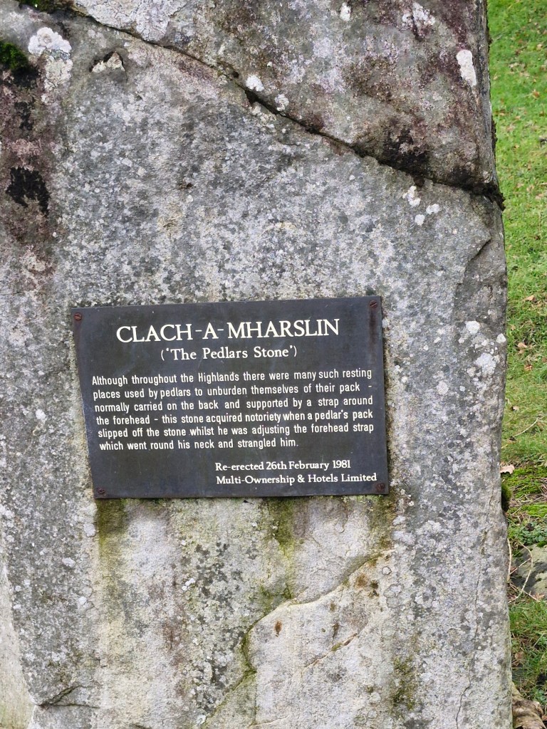 Hmm – not a cheerful tale! The Clach-a-Mharslin (Stone of the Packman) is the legend of a pedlar, travelling with a pack slung over his shoulders. Sitting down by the stone to rest, he put his pack on top of the stone. The pack slipped down the back of the stone, the loop tightening around his neck. Trapped, the heavy pack strangled him.