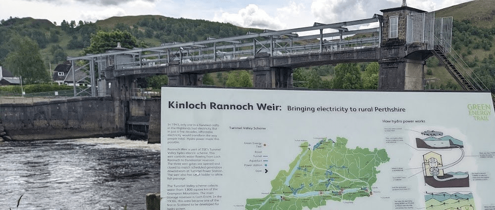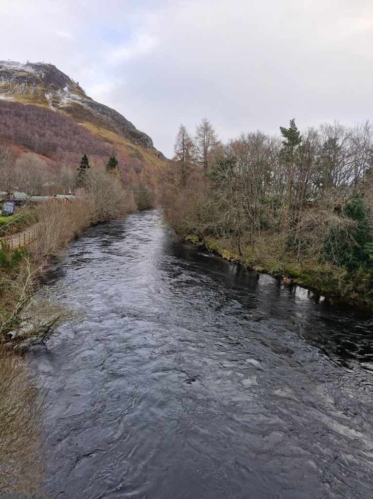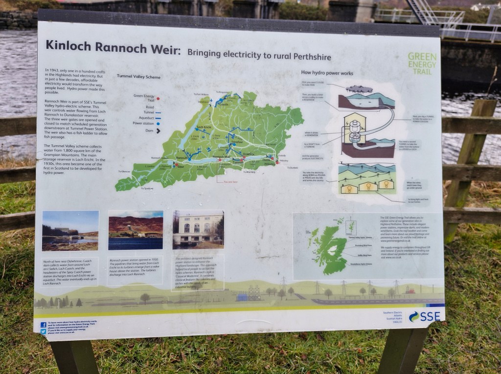 And then took the path alongside the Tummel river, past the weir. Kinloch Rannoch Weir is a low-level dam located at the eastern end of Loch Rannoch, and controls the outflow of water into the River Tummel towards Dunalastair Reservoir. As part of the wider Tummel Hydro-Electric Scheme, it regulates loch levels for environmental and power generation purposes. It is a Grade B listed structure and is believed to date back to the 18th century.